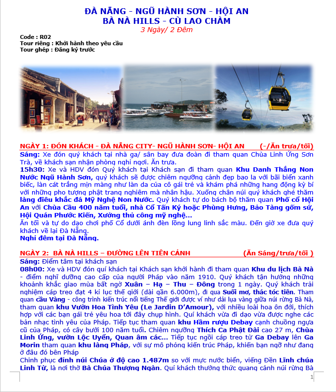 ĐÀ NẴNG – NGŨ HÀNH SƠN – HỘI AN BÀ NÀ HILLS – CÙ LAO CHÀM 3N/2D